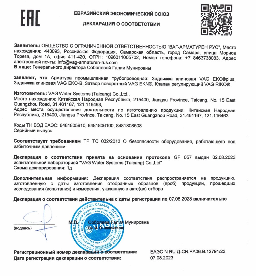 VAG Клиновая задвижка серия EKOplus PN10/16