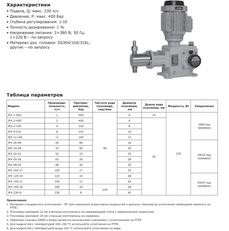 Плунжерные дозировочные насосы серии JP оснащены асинхронными электродвигателями. Насосы обладают высокой прочностью и надёжностью. Принцип действия плунжерного дозировочного насоса заключается в перемещении поршня с образованием разрежения или высокого давления. При разрежении система всасывает жидкость, при нагнетании — выталкивает ее.